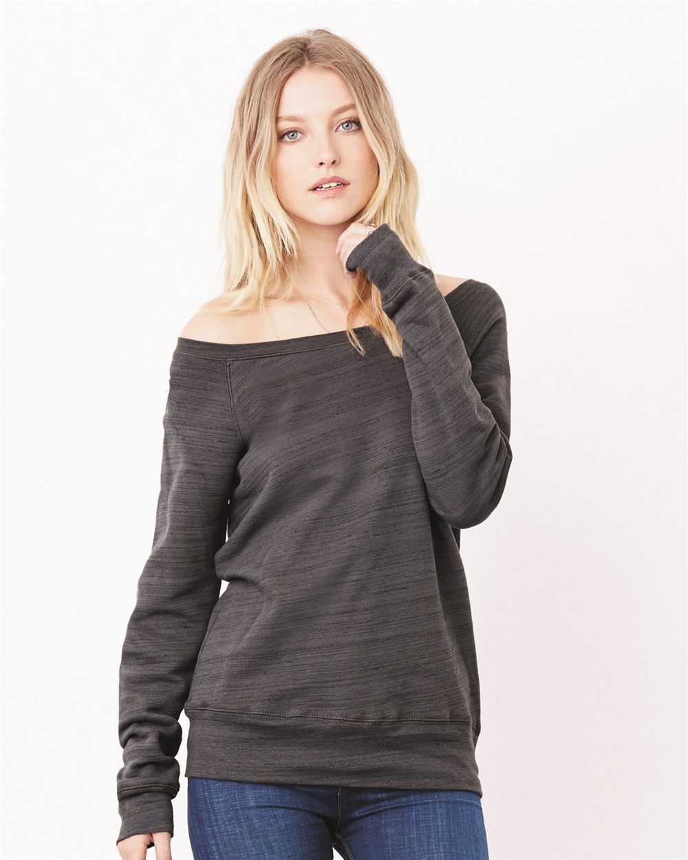 Feminine, cozy and versatile, this sweatshirt is a classic pullover with a wide neck that can be worn pulled off the shoulder. Offered in marble, acid wash, poly-cotton and triblend sponge fleece.